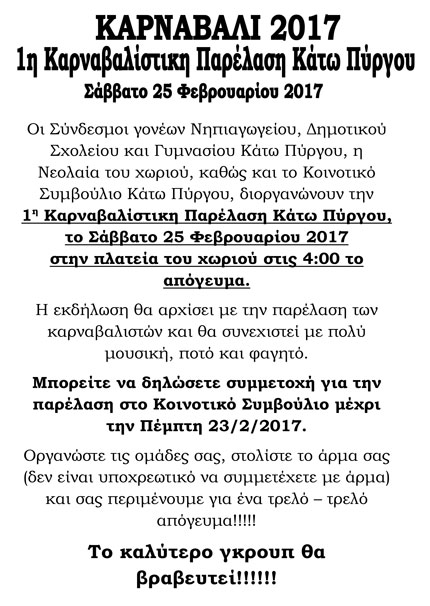 1η Καρναβαλίστικη Παρέλαση Κάτω Πύργου (25/2/2017)